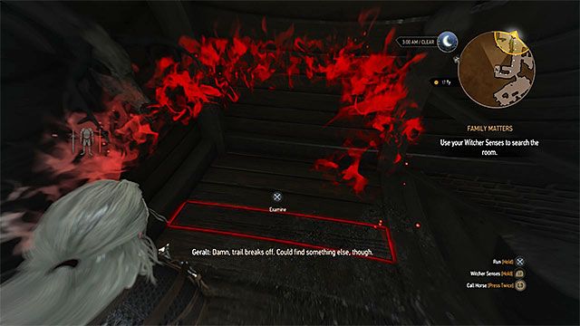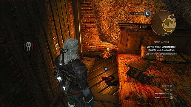 Возвращайтесь наверх, в комнату, где сидит барон. Включайте ведьмачье чутье и осматривайте подсвеченные объекты: поврежденный подсвечник, вазу с цветами, пустое место на стене и картину на соседней стене. За картиной будет дырка. С обратной стороны стены стоит шкаф. Слушаем комментарии Геральта, возвращаемся к подсвечнику и осматриваем пятна вина. Вам опять нужно идти по запаху. Вы дойдете до лестницы, немного спуститесь по ней, и вам нужно будет осмотреть деревянную половицу. Там вы найдете талисман.