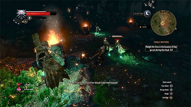 Теперь возвращайтесь к Ворожею. Следуйте за ним к месту проведения ритуала, отбиваясь по пути от волков. Там зажигайте огонь в трех местах – можно подходить к каждой корзине и нажимать кнопку взаимодействия или использовать с расстояния знак Игни.