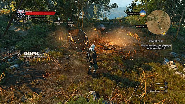 Чтобы начать это задание, вам нужно найти Жреца Вечного Огня в деревне Яворник (M2,5). В диалоге Геральта попросят сжечь тела в трех разных местах. Принимайте задание. В каком порядке вы будете обходить места, не имеет значения. Возле каждого будет группа гулей и гнильцов. Когда убьете монстров, используйте масло на трупах и поджигайте знаком Игни (+9 опыта). На одной из точек вы встретите выжившего. Поговорите с ним, он расскажет о настоящих намерениях Жреца Вечного Огня (+22 опыта).