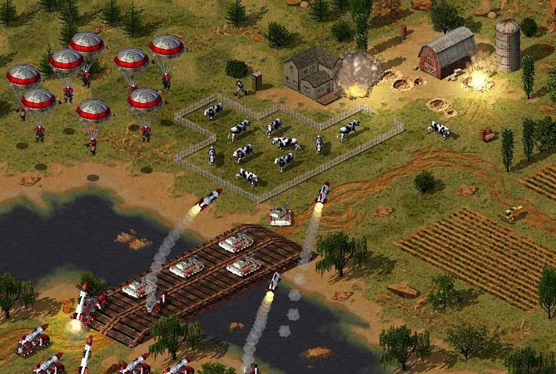 Нормальная стратегия по нынешним меркам должна иметь как минимум 15-20 видов юнитов и техники и видов 10 разных строений. Red Alert 2 к их числу относится. В игре есть полный стандартный набор: пехота, собаки, танки, самолеты, вертолеты, корабли, подлодки. Из вооружения можно выделить несколько необычное: осьминоги и дельфины, солдаты с электрическим оружием, паучки-взрыватели техники, пси-солдаты, танки-хамелеоны и т.д. В общем, пополнения в технике и юнитах, по сравнению с прошлой частью, имеются, и при том достаточно крупные. Из сооружений можно выделить следующие: клонирователь (у русских), который бесплатно производит "+1" юнит при его создании; контролер погоды (у американцев) - может сильно подпортить погоду... дождик, гроза... главное успеть закупить зонты и ласты...:) На самом деле эта агрегатина может вызвать гигантскую грозовую тучу, которая испепелит в пух и прах все в радиусе своего действия.![]()