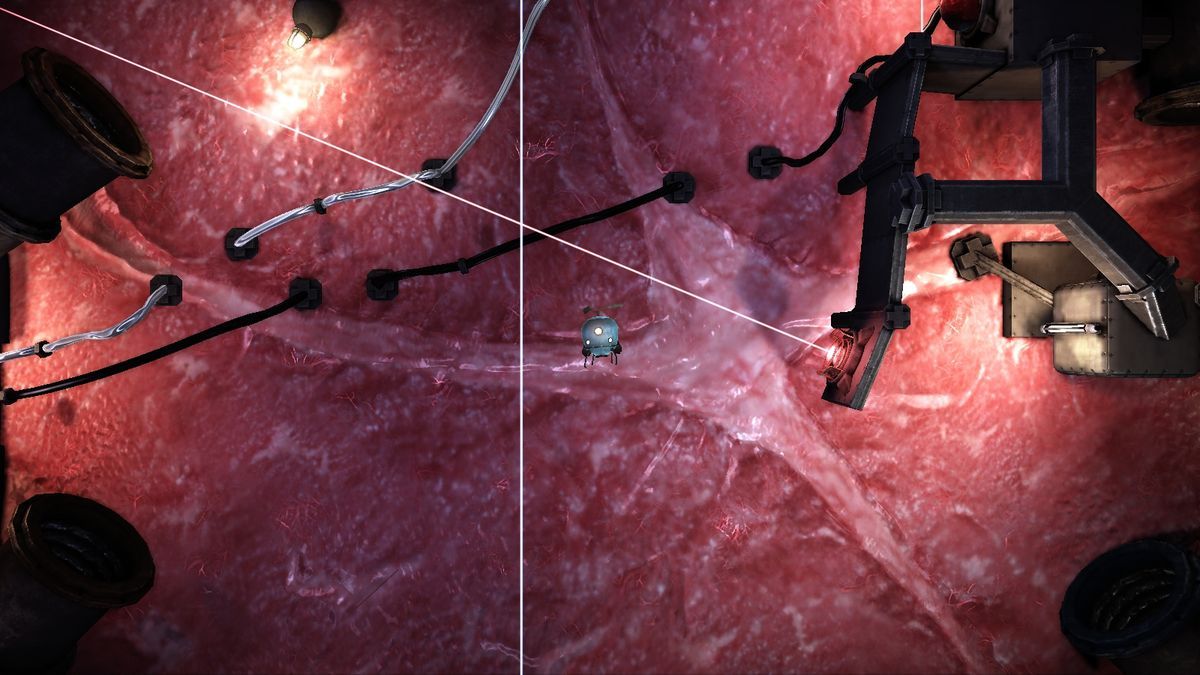 В нем вы, в роли похищенного маленького робота, пытаетесь найти выход из непонятного места, снуя по трубам, лабораториям и пещерам. Однако в здешнем подземелье вы не один, время от времени кто-то на мгновение выглядывает из-за темного угла и пристально смотрит в сторону игрока, сверху опускаются камеры видеонаблюдения и как будто изучают героя. После чего чувствуешь себя как под колпаком, отчего сразу возникают ассоциации с Limbo, где эффект чужого присутствия еще больше. Это пробуждает недюжинный интерес и начинает возникать масса вопросов. Кто они? Что у них на уме? Зачем вы им нужны? К сожалению, как и в монохромной головоломке о маленьком мальчике, практически все вопросы, будоражившие голову так и не находят ответа, оставляя простор для фантазии и разочарования от нераскрытой истории. И никто, в принципе, не имел бы никаких претензий, раскрой разработчики этот момент более полно или наоборот вообще не касались бы его. А так остается ощущение, будто вас прервали перед моментом, когда вот-вот собирались чихнуть. Не конец света конечно, но все равно неприятно.