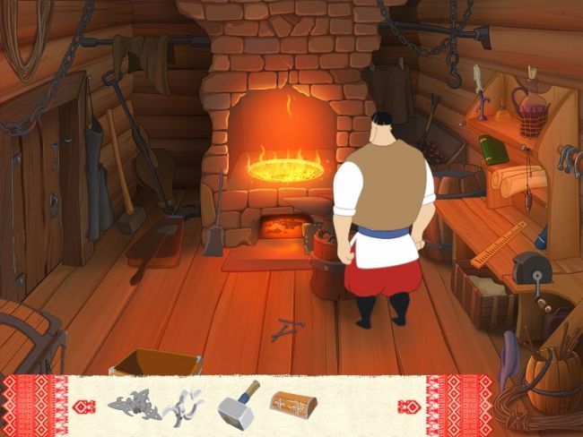 С этими самыми "мотивами" приходится сталкиваться постоянно: они отчетливо прослеживаются в поведении и поступках персонажей, а также неоднократно упоминаются в диалогах. Кстати, о беседах. В них Вакула-кузнец (огромных размеров детина, для которого размозжить головушку — раз плюнуть) по-прежнему выступает этаким простачком-добрячком — на откровенную грубость и нежелание общаться ласково проговаривает что-то вроде "будь здоров, мил человек" и преспокойно шествует дальше. Добрая душа, ничего не скажешь. Пиксельхантинг в "Вечере накануне Ивана Купала" не возведен в абсолют. И дело тут вовсе не в заботе об игроке и попытке создать логичный геймплей — просто маленький размер локаций не позволяет часами шарить курсором по углам игрового экрана. Количество мест, где посчастливится побывать Вакуле, чуть больше оригинала, однако и это не спасает проект — без особых сложностей вы пробежитесь по квесту за пару часов. Из этого времени большую часть занимают беседы с героями сказки, а непосредственно процесс размышлений так и вовсе находится где-то на неприличной отметке. Только вжились в роль молодца-удальца, только почувствовали оригинальное переложение классического произведения — а тут и сказке конец, кто слушал молодец...